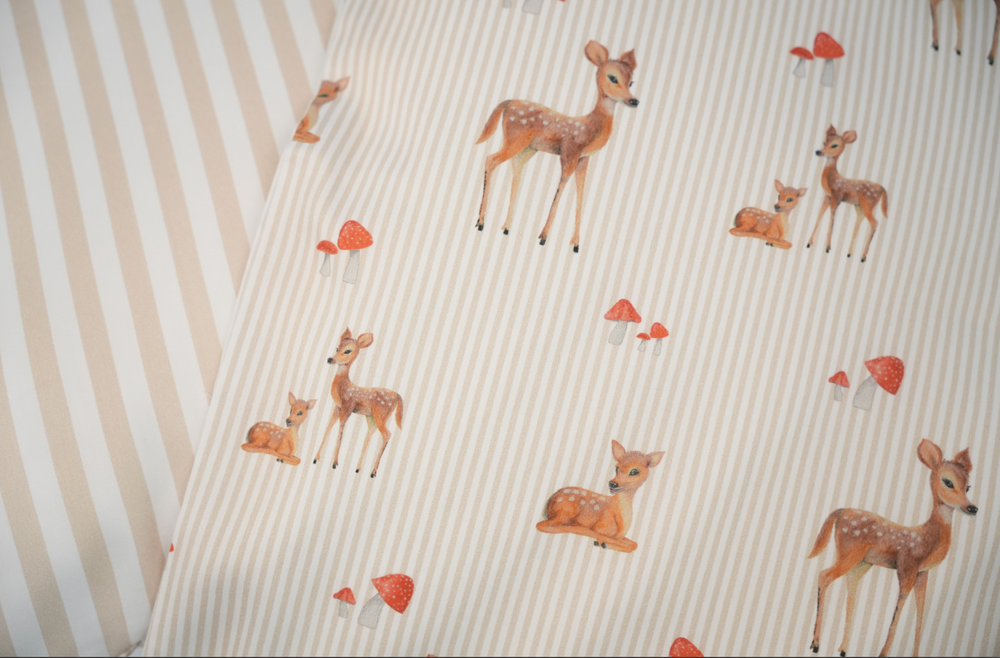 Sengetøjet er lavet af 100 % blød bomuldssatin (TC300) og har et dobbeltsidet design med smalle striber og dådyrsmotiver foran og brede striber bagpå. Produceret i Europa og OEKO-TEX® klasse 1-certificeret, som garanterer, at sengetøjet er fri for skadelige kemikalier, så børnene trygt kan putte sig under det. Leveres i en genanvendelig stofpose og har praktisk lynlås i dynebetrækket og flaplukning på pudebetrækket.